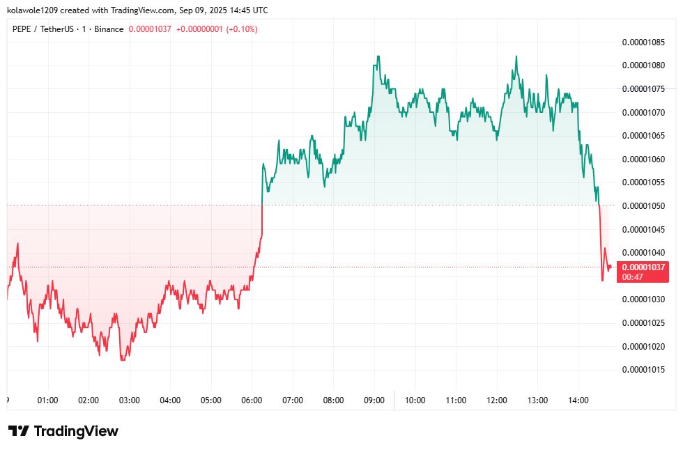 Pepe (PEPE) has managed a slight rebound, trading around $0.000001058 after climbing 2.7% in the past 24 hours. The meme coin chart shows PEPE bouncing off recent lows near $0.00000090, with buyers attempting to reclaim short-term moving averages.