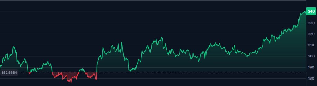 At press time, Solana trades at $240, following a noteworthy 6.2% intraday upsurge, which brings its total monthly gains to 20%. This is accompanied by a 33% rise in trading volume with over $12 billion worth of SOL traded across exchanges over the last 24 hours.