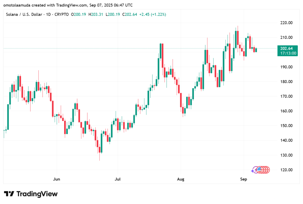 Solana has remained consistent, currently trading at approximately $207.64 after reaching a local high of $218. The price movement indicates good consolidation at the level of the support above the $200 mark, which shows that buyers are still in control even though there is some short-lived pullback.