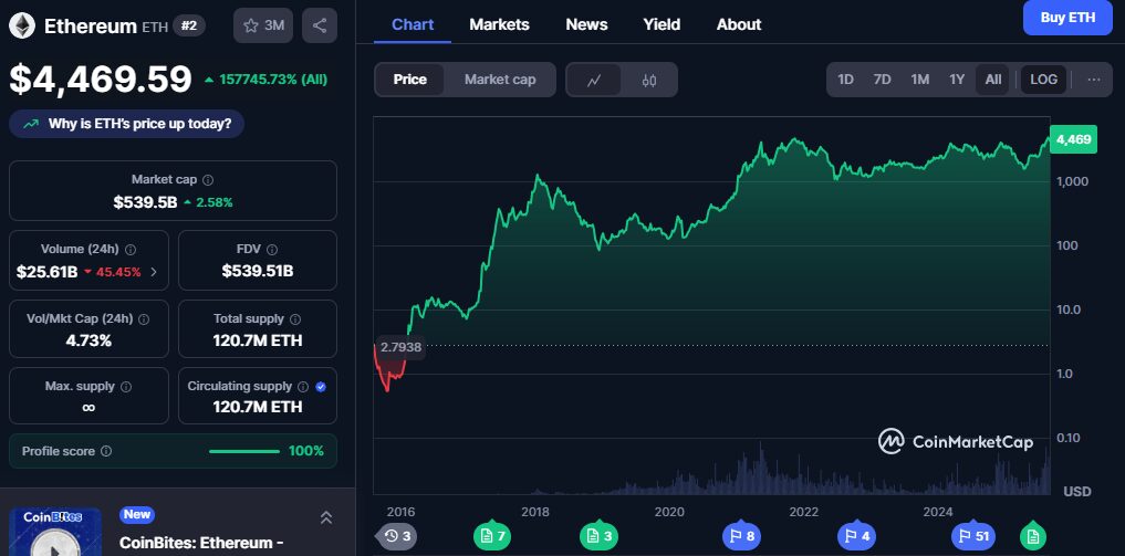 Ethereum’s performance has been characterized by upward and downward swings. Peaks in 2017, 2021, and again in 2025 confirm its long-term resilience. Trade around 4,500 is a good indication of a bullish market sentiment, but price consolidation before new highs are achieved is still possible.