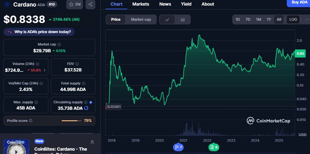 ADA is presently selling at 0.8338, and the market capitalization stands at 29.79 billion.