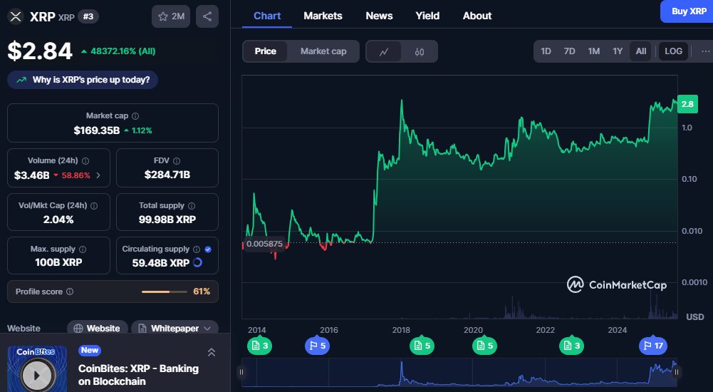 XRP is listed at a price of 2.84 with a market capitalization of 169.35 billion, making it the third-largest in total. The volatility and strength of this is reflected in its price growth of 48,372% since inception. In spite of the regulatory issues experienced in the previous years, XRP is still at the center of cross-border settlement solutions.