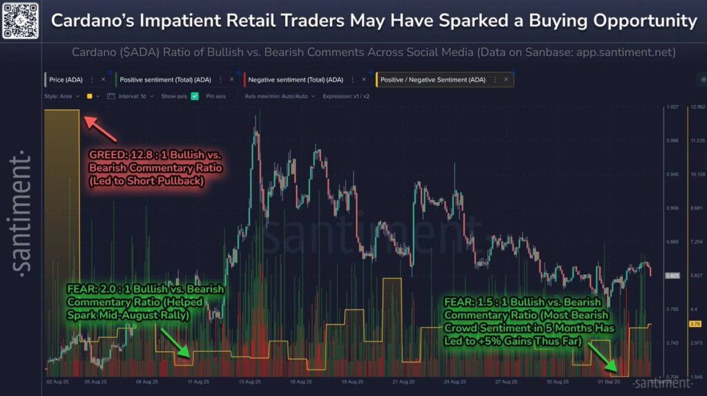 Still, sentiment is at a five-month low. Despite that, the Cardano price is up 5%, showing bullish divergence. Cointelegraph reports whales are buying while retail traders exit – typical of early smart money moves.