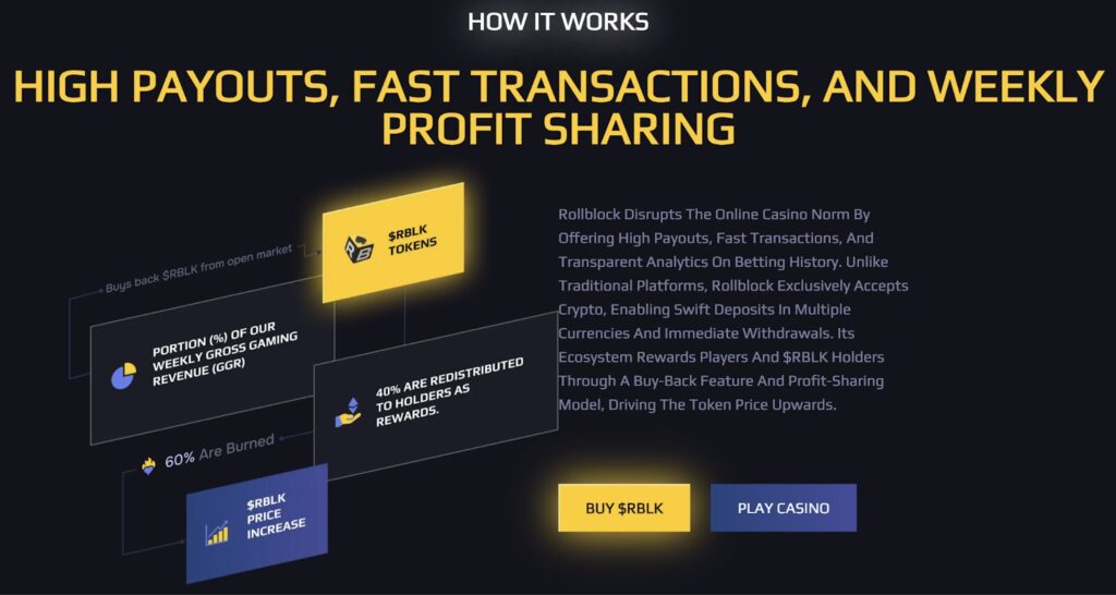 Unlike inflationary new crypto coins, the model channels 30% of platform revenue into RBLK buybacks, with 60% of those tokens burned permanently and 40% distributed as staking rewards. This deflationary design gives Rollblock the appeal of an undervalued crypto poised for long-term growth.